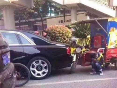 快遞小哥匆匆忙忙的送快遞,在車水馬龍的人流中,一個不小心,追了前車的尾,撞掉了前車的後保險槓。快遞小哥他認識這輛車,價值200多萬的豪車,被他的電動車給撞壞了。