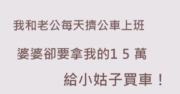 哈摟哈摟各位讀者~~我是有錢人這麼想小編Choco!今天要來說說關於「我和老公每天擠公車上班,婆婆卻要拿我的15萬嫁妝給小姑子買車!」,不知道大家有沒有興趣呢!一起來看看是怎麼樣的事吧!