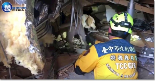 台中市支援花蓮大地震的搜救隊,清晨進駐統帥飯店現場,救難人員除了使用生命探測雷達,並派出搜救犬「鐵雄」進入倒塌的大樓內搜尋,協助縮小搜救範圍。