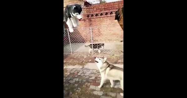 趕緊出來的主人就看著二哈在繩子底下衝著玩具狗一陣叫喚,可能是把玩具掛在繩子上的姿勢有點過分了,讓二哈信以為真了……這群二哈開始同情心氾濫了~