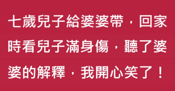 哈摟哈摟各位讀者~~我是有錢人這麼想小編Choco!今天要來說說關於「七歲兒子給婆婆帶,回家時看兒子滿身傷,聽了婆婆的解釋,我開心笑了!」,不知道大家有沒有興趣呢!一起來看看是怎麼樣的事吧!