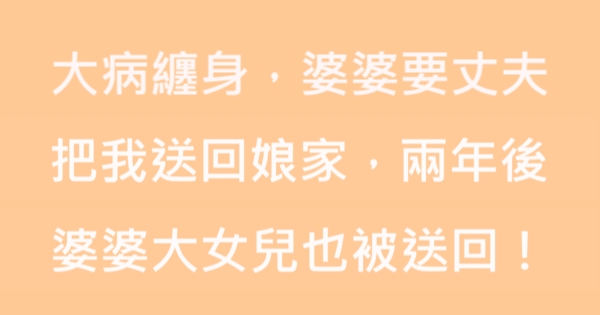 大病纏身,婆婆要丈夫把我送回娘家,兩年以後,婆婆大女兒也被送回!