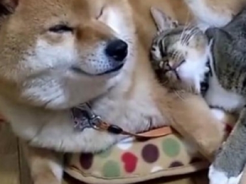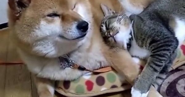貓咪緩緩的又躺在了柴犬身旁,真的,寵物的感情比人的感情還甜蜜,真是小吵小鬧一會就好了。