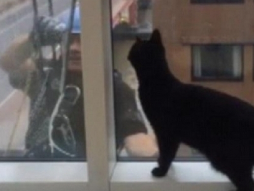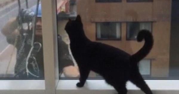 拍攝視訊的人說,她住的公寓每個月都會有蜘蛛人高空作業擦玻璃,然後有一次正好被家裡貓看到了,貓看著工人在玻璃上來來回回動,覺得十分有趣,後來就經常坐在這個位置等那名工人出現。