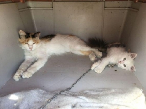 拴著小貓咪的地方,太陽從早晒到晚 ,特別熱,當時大夏天,六月實在殘忍,遮陰的地方是我以前買的狗窩,可那是塑料的,特別悶~