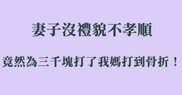 大家好,我是有錢人這麼想小編Choco!今天要來說說關於妻子沒禮貌不孝順,竟然為三千塊打了我媽打到骨折!我用一招就讓她一無所有!的事!不知道大家對於這個有多了解呢?一起來看看吧!