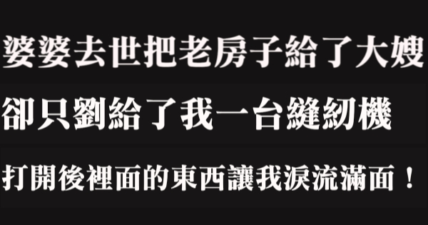 大家好,我是有錢人這麼想小編Choco!今天要來說說關於婆婆去世把老房子給了大嫂,只給了我一台縫紉機,打開後裡面的東西讓我淚流滿面!的事!不知道大家對於這個有多了解呢?一起來看看吧!