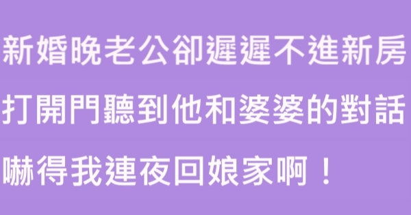 新婚晚老公卻遲遲不進新房,打開門去找他竟聽到他和婆婆的對話,嚇得我連夜回娘家啊!