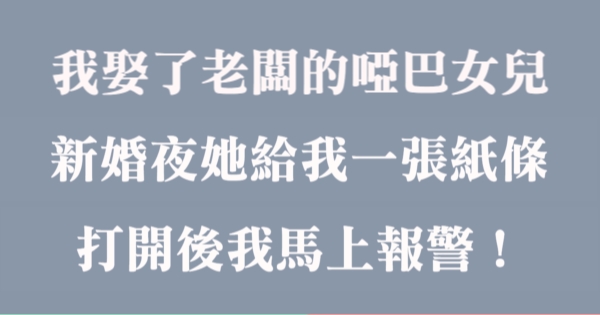 哈摟哈摟各位讀者~~我是有錢人這麼想小編Choco!今天要來說說關於「我娶了老闆的啞巴女兒,新婚夜她給我一張紙條,打開後我馬上報警!」,不知道大家有沒有興趣呢!一起來看看是怎麼樣的事吧!
