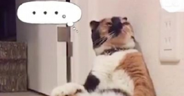 貓咪聽到開門聲後,回神了,腦袋上揚,臉貼著牆壁,慢慢地,慢慢地,翻了下去。看起來有些悲傷。