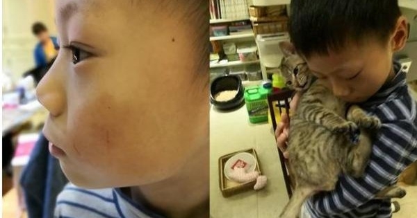 小學三年級的弟弟臉蛋被小皮貓Rocky抓傷,但他沒有責怪小貓,反而親暱地抱在懷裡說,「雖然你抓我很痛,但我還是很愛你的。」媽媽Grace Yang看到這一幕覺得很溫暖, 「看孩子這麼愛動物,好純淨的心,自己也很感動。」