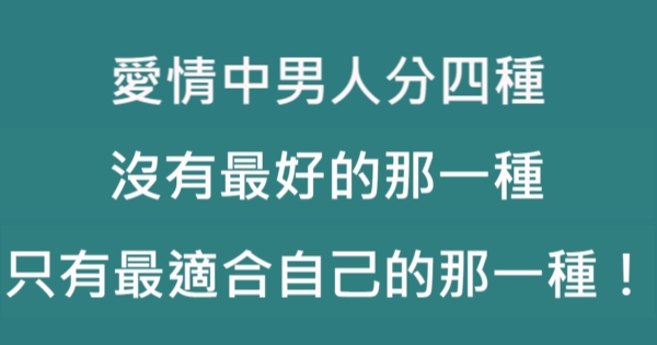 大家好,我是 Ant 今天來跟你說說 愛情中男人分四種,沒有最好的那一種,只有最適合自己的那一種!吧!讓我們來看看!