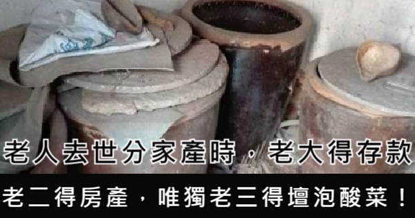 老人去世分家產時,老大得到存款,老二得到房產,唯獨老三得壇泡酸菜!