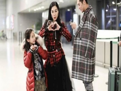依然是在機場,張倫碩隻提了一個包,悠閒地牽著孩子走在前面,而鐘麗緹背著