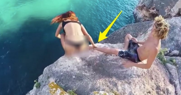 正妹懸崖邊「準備跳水」,「重心不穩」想抓住男友,沒想到「他卻一腳踢開」網友「這才是好男友啊!」