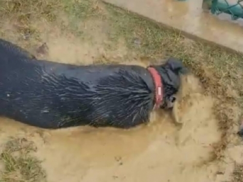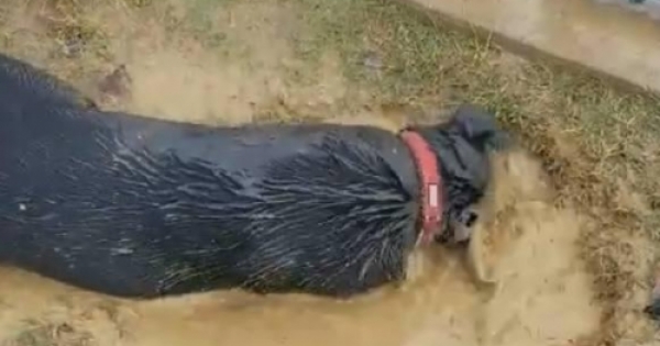 沒想到一個沒注意,狗子就飛奔走了,等主人回過神的時候,已經徹底悲劇了,只見狗子一頭就扎進了旁邊的一個泥潭裡,主人正要阻止,這貨就開始打了好幾個滾,主人看著這狗子,頓時生無可戀……