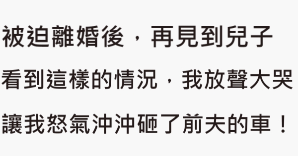 大家好,我是 Choco 今天來跟你說說 被迫離婚後,再見到我的兒子看到他這樣的情況,我放聲大哭,怒氣沖沖砸了前夫的車!吧!讓我們來看看!