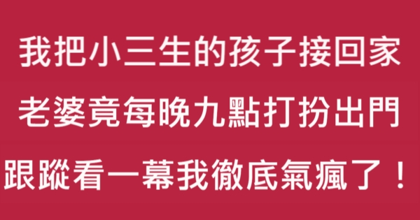 大家好,我是 Choco 今天來跟你說說 我把小三生的孩子接回家,老婆竟每晚九點打扮出門。一路跟蹤,看這一幕,我徹底氣瘋了!吧!讓我們來看看!