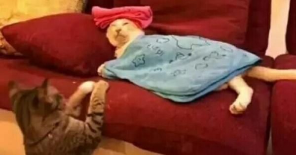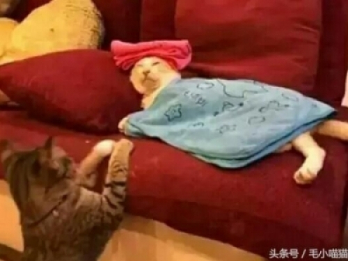 妹子趕緊忙乎起來,給貓咪頭上放個溼毛巾,身上改蓋個毯子,貓咪就成這樣了。