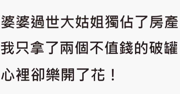 大家好,我是 Choco 今天來跟你說說 婆婆過世大姑姐獨佔了房產,我只拿了兩個不值錢的破罐子,心裡卻樂開了花!吧!讓我們來看看!