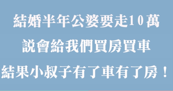 哈摟哈摟各位讀者~~我是有錢人這麼想小編Choco!今天要來說說關於「結婚半年公婆要走10萬,說會給我們買房買車,結果小叔子有了車有了房!」,不知道大家有沒有興趣呢!一起來看看是怎麼樣的事吧!