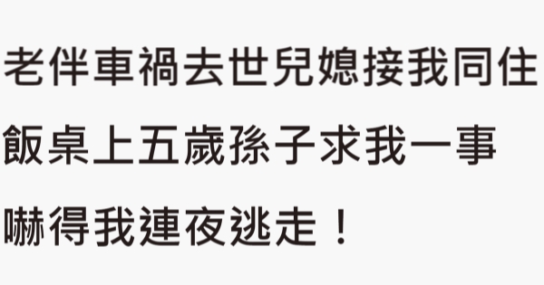 大家好,我是Choco 今天來跟你說說 老伴車禍去世兒媳接我同住,飯桌上5歲孫子求我一事,嚇得我連夜逃走!吧!