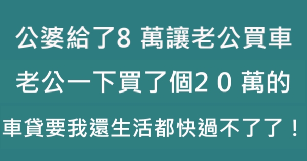 哈摟哈摟各位讀者~~我是有錢人這麼想小編Choco!今天要來說說關於「公婆給了8萬讓老公買車,老公一下買了個20萬的,車貸要我還生活都快過不了了!」,不知道大家有沒有興趣呢!一起來看看是怎麼樣的事吧!