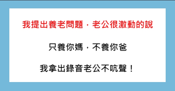 哈摟哈摟親愛的大家~~我是有錢人這麼想小編Choco!今天要來說說關「我提出養老問題,老公很激動的說,只養你媽,不養你爸!我拿出錄音老公不吭聲!」的事件!讓我們一起來看看吧!