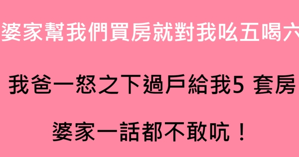 大家好,我是有錢人這麼想小編Choco!今天要來說說關於婆家幫我們買房就對我吆五喝六,我爸一怒之下過戶給我5套房,婆家一話都不敢吭!的事!不知道大家對於這個有多了解呢?一起來看看吧!