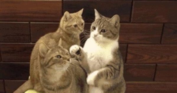 貓咪想要跟主人討食物,結果賣萌時不小心碰到同伴,下場整個很慘,主人在旁笑到快岔氣XDD