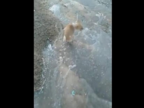主人出去辦事的時候,這隻狗狗也跟了出來,而主人在茶館談生意的時候,狗狗就自己玩,而狗狗看到這些水邊的時候,就去水邊撒尿,沒想到,它尿完了卻被冰塊直接把腳給凍住了,狗狗被凍住之後,沒有辦法動,只能不斷的大聲在叫,而主人聽到狗的叫聲後,趕緊過來看了下,看到狗狗被凍在水裡的情景,覺得太逗了,忍不住笑了起來,想不到狗狗撒泡尿也能被凍住。