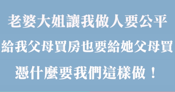 老婆大姐讓我做人要公平,給我父母買房也要給她的父母買,憑什麼要我們這樣做!