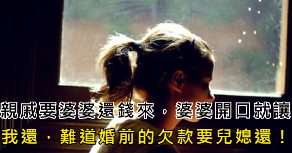 看完後是不是覺得Choco小編在有錢人這麼想分享的女人故事文章讓人深思呢?想看更多好文,或是喜歡有錢人這麼想的文章的話,可以按讚追蹤女人樂生活並分享這篇「親戚要婆婆還錢來,婆婆開口就讓我還,難道婚前的欠款要兒媳還!」出去給大家一起看看!