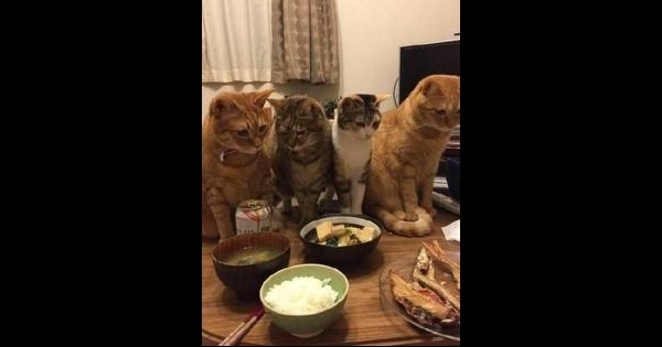 這天,主人正在吃飯,突然感到一陣不對勁,抬頭一看瞬間笑噴了!只見4隻貓咪站成了一排,直勾勾的盯著自己的碗,一副口水都要留下來的樣子簡直不能更可愛。