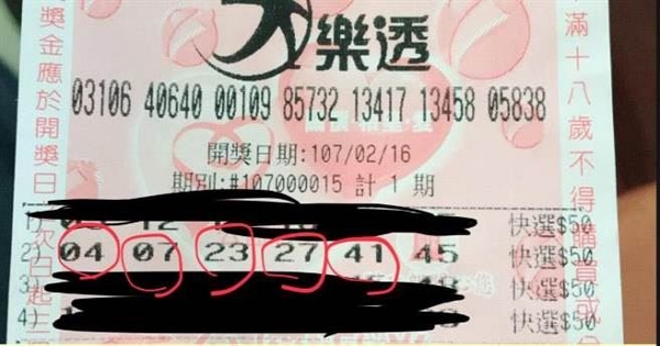 從原PO貼出的彩券照可見,2月16日開出的獎號為04 、07、 23、24、27、41開獎,而他花了200元買了4注,其中第二注他簽的是04、07、23、27、41、45,果真幸運地中了5碼。