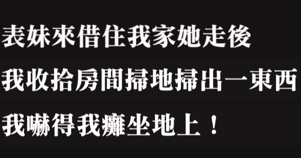 大家好,我是有錢人這麼想小編Choco!今天要來說說關於表妹來借住我家,她走後我收拾房間,掃地掃出一東西,我嚇得我癱坐地上!的事!不知道大家對於這個有多了解呢?一起來看看吧!