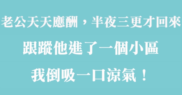 大家好,我是 Choco 今天來跟你說說 老公天天應酬,半夜三更回來,跟蹤他進了一個小區,倒吸一口涼氣!吧!讓我們來看看!