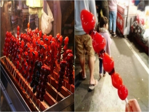當然也有整支都是草莓的糖葫蘆,不過比較少見,而且老闆在擺放的時候也得注意角度