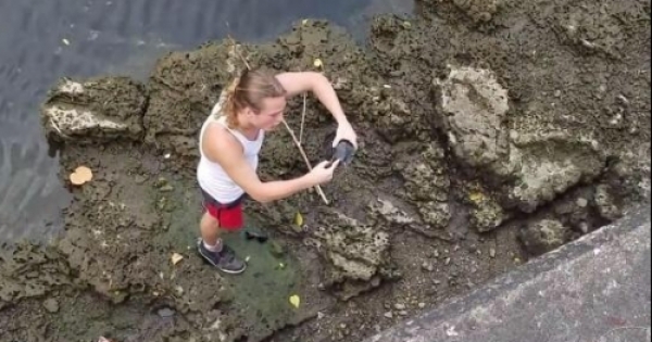 這名男子在河邊遊玩的時候,無意中發現石頭縫裡有一隻烏龜。男子非常高興,想著將這隻烏龜帶回去當寵物來養。可是等到男子準備將這隻烏龜拿起來的時候,男子卻傻眼了!