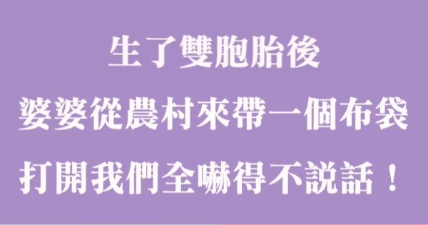 各位讀者安安阿~~我是有錢人這麼想小編Pineapple!今天要來說說關於「生了雙胞胎後,婆婆從農村來帶一個布袋,打開看後我們全都嚇得不敢說話!」,不知道大家有沒有興趣呢!一起來看看吧!