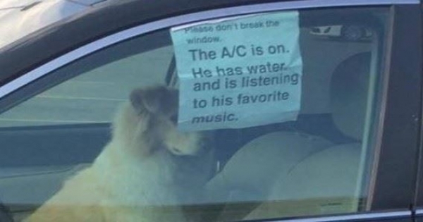 上面寫著:請不要砸車窗,空調正開著,狗子有水喝,還放著牠最喜歡的音樂。