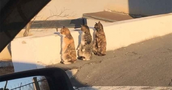 這名俄國司機在路邊發現了有三隻貓咪,宛如是狐獴上身,坐得直挺挺的專注於前方的事物。如此奇妙的畫面讓司機忍不住拿出手機來拍...