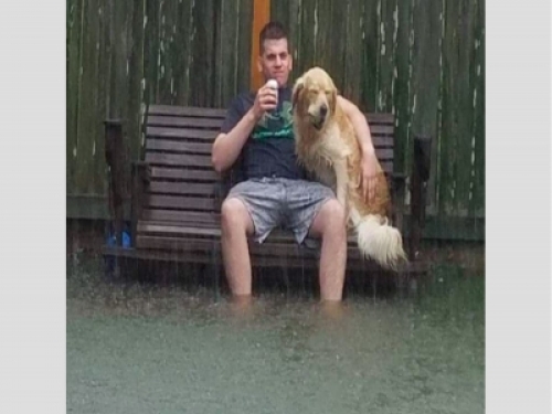 在颶風侵襲淹大水的期間,就有人目擊一位路人跟他的黃金獵犬超淡定,水都已經淹起來了,男子還喝著啤酒,帶著自家阿金感覺好像沒發生什麼是一樣的在發呆!