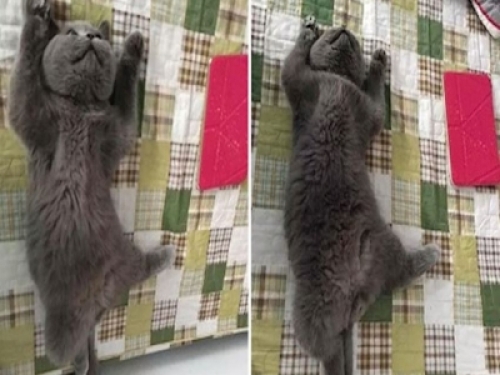 貓咪就這樣安安靜靜毫無生氣地用之前從未見過的姿勢躺在床上,網友瞬間還以為貓咪死了正難過…