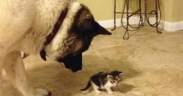 小貓似乎被遺棄了,剛好被狗狗發現了,狗狗把小貓叼到主人面前,露出一臉憐愛的表情,在哀求著主人把它抱回家飼養,原本主人嫌麻煩打算不收養的,但是看到狗狗的這憐愛表情,最後柔軟的內心還是收養了小貓。