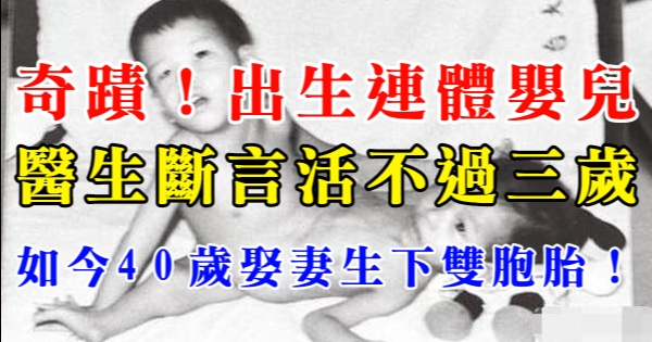 大家好,我是健康一點靈小編CA!今天要來說說關於「奇蹟!出生連體嬰兒,醫生斷言活不過三歲,如今40歲娶妻生下雙胞胎!」的事!不知道大家對於這個有多了解呢?一起來看看吧!