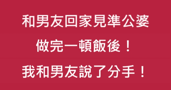 大家好,我是 CA 今天來跟你說說 和男友回家見準公婆,做完一頓飯後,我和男友說了分手!吧!讓我們來看看!