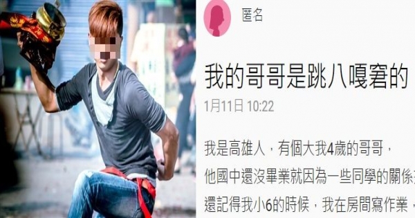 我是高雄人,有個大我4歲的哥哥,他國中還沒畢業就因為一些同學的關係接觸了陣頭,還記得我小6的時候,我在房間寫作業,客廳就聽到我爸跟我媽在破口大罵,我偷偷下樓去看,就看到我哥跪在客廳然後爸媽就一直罵一直罵,而我看到我哥左小腿去給人刺了青,刺了甚麼我也看不太出來。