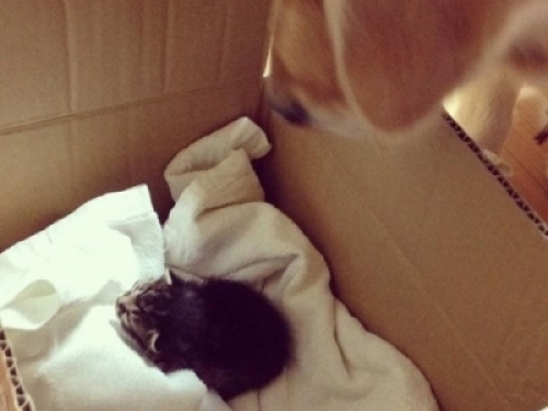 寵主上前一看,箱子裡面有隻小貓咪,自己都卷成一個毛球了,看上去又冷又餓,看看了旁邊的金毛,他一副可憐的樣子看著我,我似乎明白他的意思,想讓我把它領回家,我不忍心看到貓咪這樣,也不忍心看著自己狗狗哀怨的眼神,我隻好把貓咪接回了家