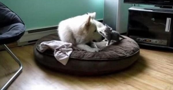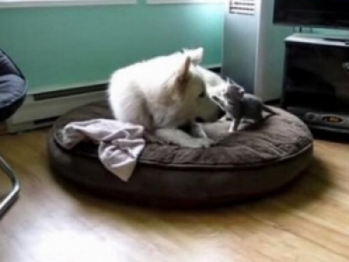 面對小奶貓的挑釁,狗狗也很無奈,於是只能做做樣子,怒吼了幾句,哪裡知道小奶貓根本就不把狗狗放在眼裡,被怒吼之後還是扭著狗狗鬧個不停。